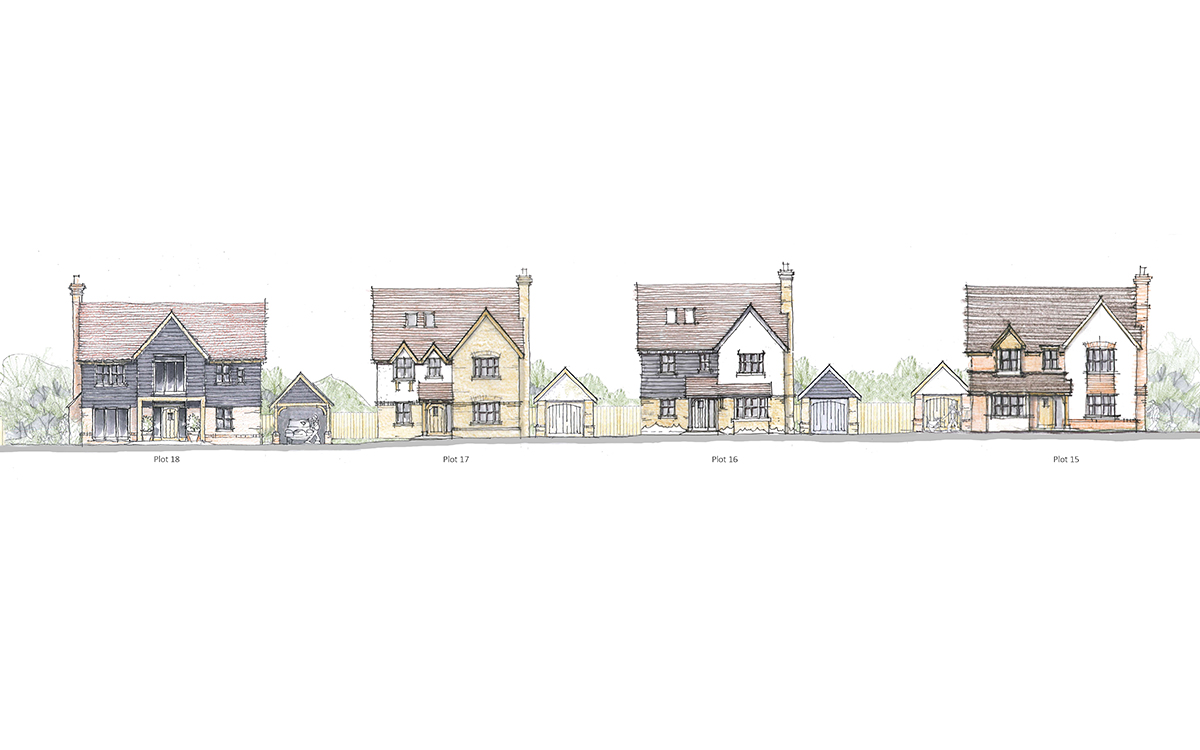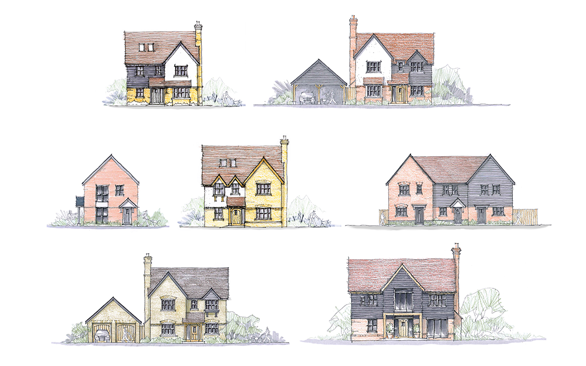 The design and character of the houses gradually changes from the entrance off Stanstead Road to larger barn-style houses and outbuildings next to Alsa Wood, an ancient woodland which forms a natural backdrop to the development.